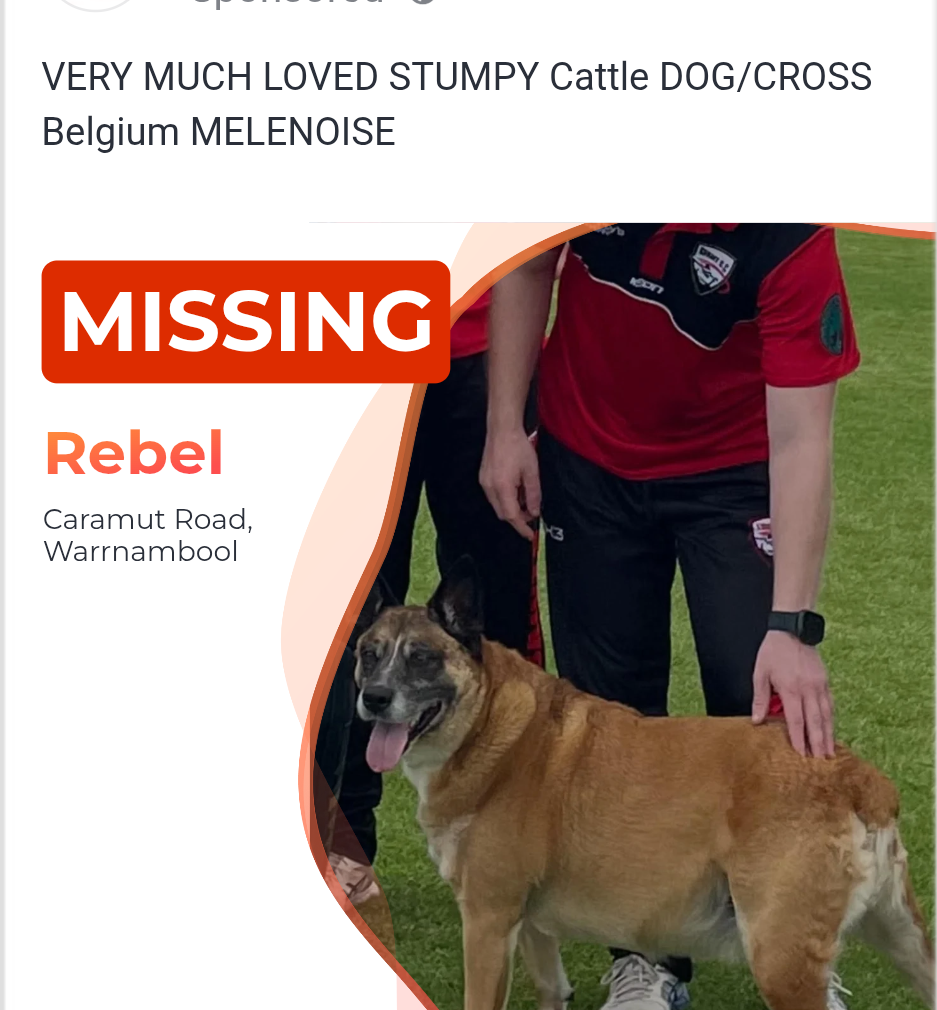 Rebel went missing on Sunday at 11 pm at Davidson Oval /Caramut M Road.